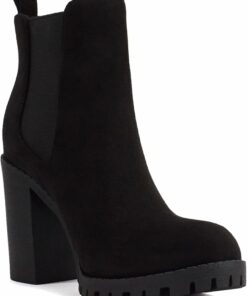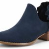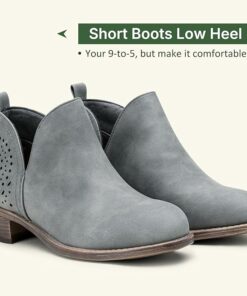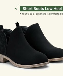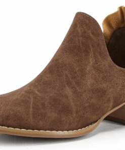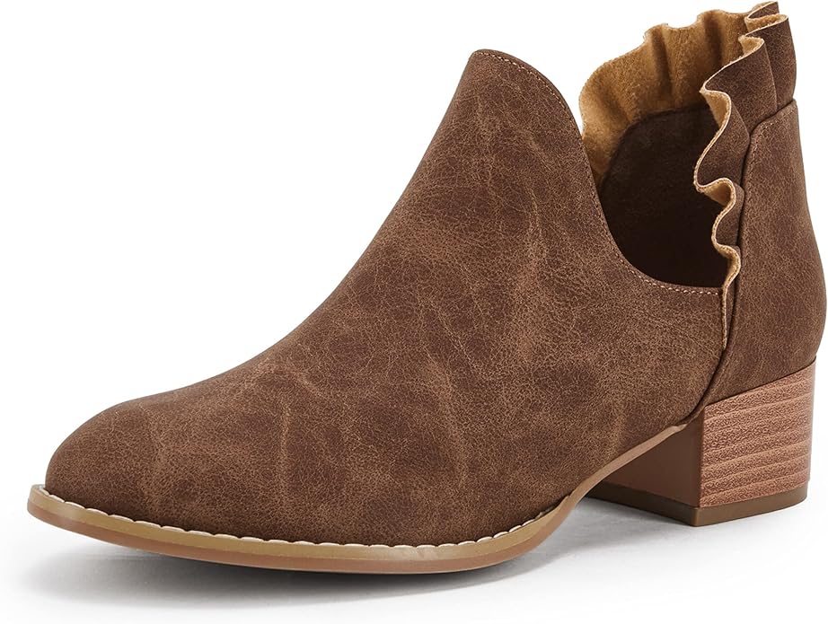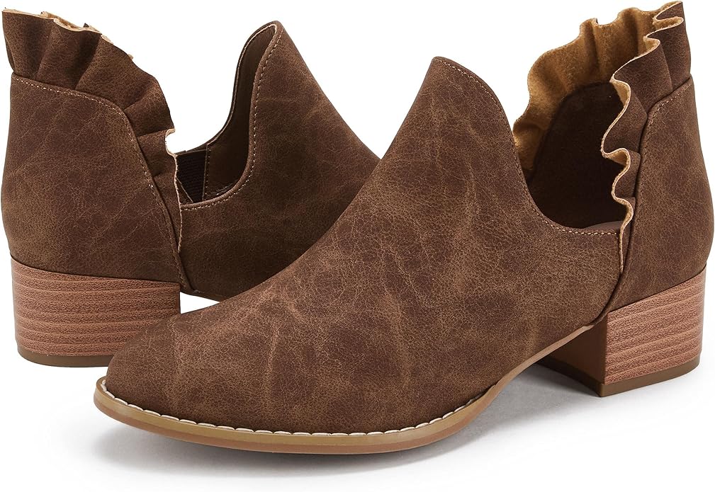- Features: Ruffled design patchwork, pointy toe, stacked low heel, western style, V cut out, faux leather/faux suede, solid color ankle boots