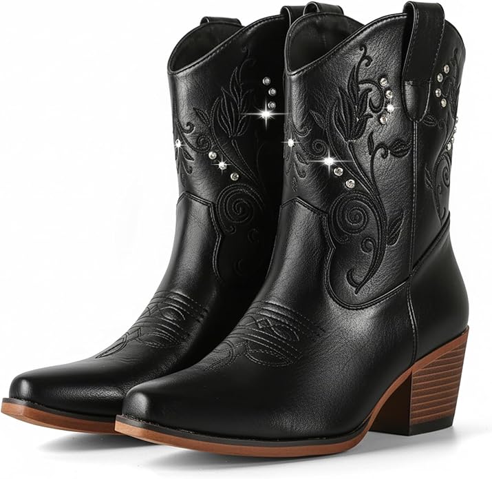 - 【Cowboy Boots for Women with Chunky Heel】Experience authentic Western style in these cowboy boots for women.Eye-catching embroidered and rhinestone details pair with a sturdy block heel for retro charm and stable comfort